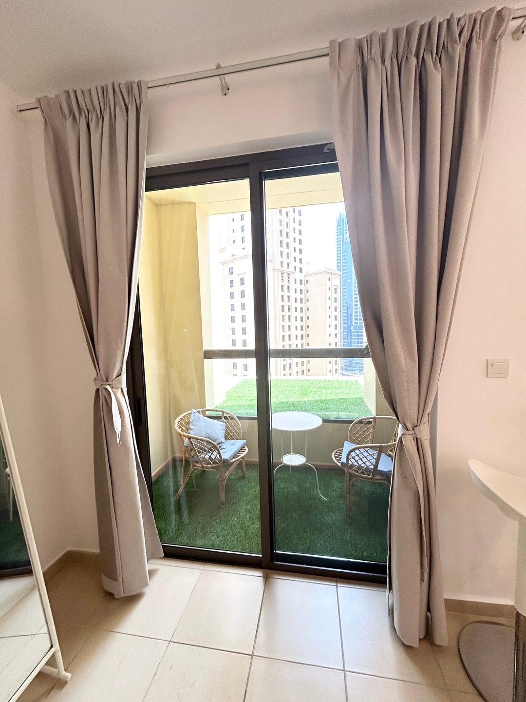 You can easily walk to cool cafes and restaurants by the beach – a few minutes away. The beach itself is super close, like a 3-5 minute stroll. And guess what? There's a tram station called JBR 2 just 500 meters away! Our apartment is big and has cool, new furniture. Imagine having your own balcony where you can see the Dubai Marina and the pools – pretty cool, right? It's like living in the heart of everything, with easy access to cool shops and stuff. Enjoy your time here!
